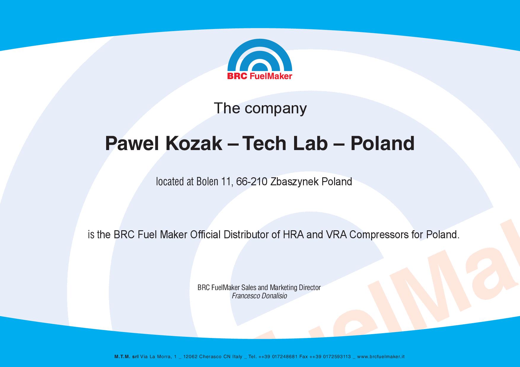To whom it might concern, BRC FUEL MAKER of via Industria 6, Cherasco (CN) Italy, has established a new distribution network for its products within the territories of Poland. Tech-Lab is appointed as BRC FuelMaker official distributor within the territories of Poland based on agreement signed.